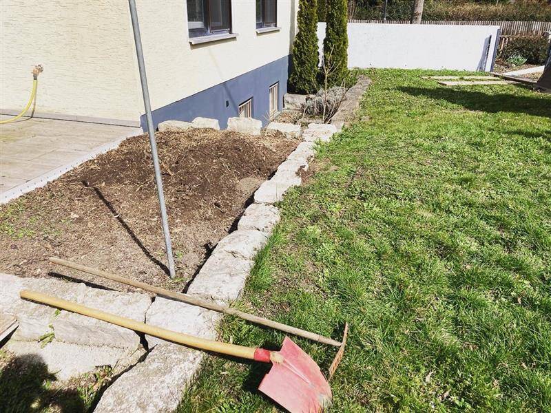 Hier haben wir einen Baumstumpf ausgefräst, das Beet eingeebnet und neu bepflanzt.