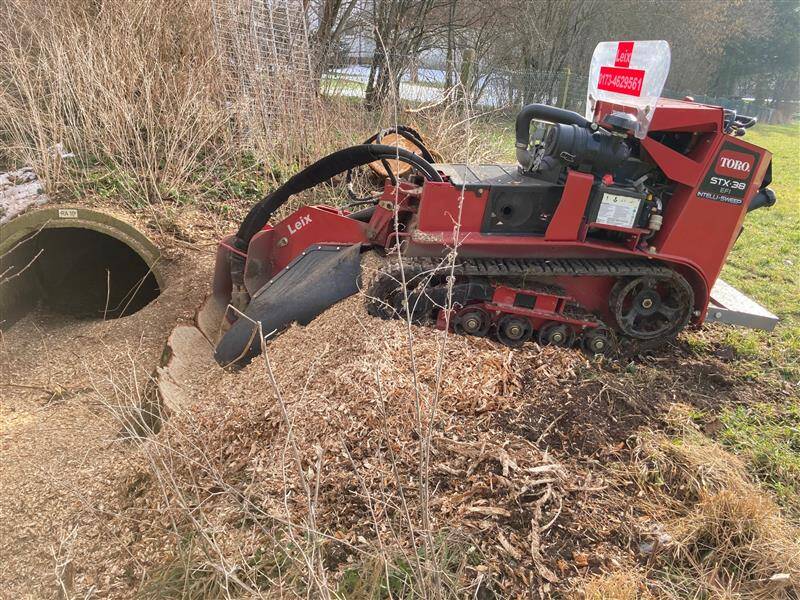 Hier war der Bachlauf durch den Baumstumpf so verengt, dass das Wasser nicht sauber ablaufen konnte. Durch das Fräsen wurde nichts am Rohr beschädigt.